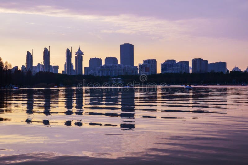 DUSK2. Parc de siècle de Changhaï C'est un endroit très bel, le lac a reflété le bâtiment de ville, nostalgie