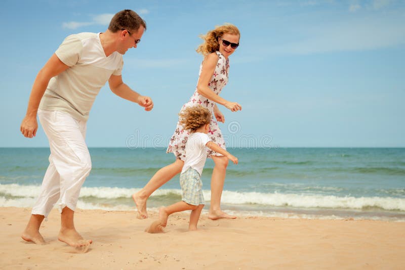 Famille heureuse de jouer à la plage au moment du jour