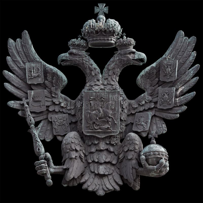 Armoiries de l'Empire russe (Aigle bicéphale) sur le Monument à Nicolas Ier à Saint-Pétersbourg, en Russie. Isolé sur fond noir.